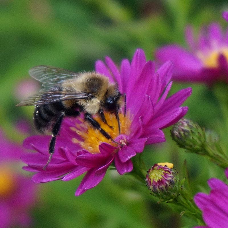 24-36" tall x 24-30" wide. KICKIN® Carmine Red Aster is perfect for adding mounds of late-season color to sunny beds and borders. Selected for their compact growth habit and abundance of blooms, Carmine Red flowers from late-summer into mid-autumn attracting bees and butterflies to their golden-eyed blooms. Plant KICKIN® Carmine Red Aster in drifts among butterfly gardens or naturalize in meadows. The compact form also lends itself to rock gardens and containers. Plant alongside ornamental grasses and other fall-blooming perennials for an eye-catching display. Easy to grow in full sun and rich, moist soils. Provide ample moisture and adequate drainage. Good air circulation keeps the lush green foliage disease-free. Carmine Red makes a long-lasting cut flower for autumn arrangements. An excellent native selection that is long lived and resistant to deer and rabbit browsing.